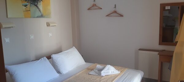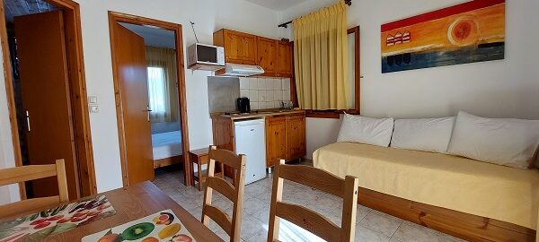 Апартманот се наоѓа на прв кат и располага со две простории. Во првата просторија е кујната која е комплетно опремена со кујнски инвентар, мал фрижидер, шпорет со две рингли, аспиратор, микробранова печка, чајник и има кревет на извлекување наменет за спиење на 2 лица. Овде има плакар за алишта и клима уред. Од оваа просторија се излегува на тераса со поглед во двор полн со зеленило. Втората просторија е спалната соба во која има еден дупли кревет комотен за спиење на две лица, ТВ и сеф за лични работи. Апартманот располага со стандардно купатило и WC со фен за коса.