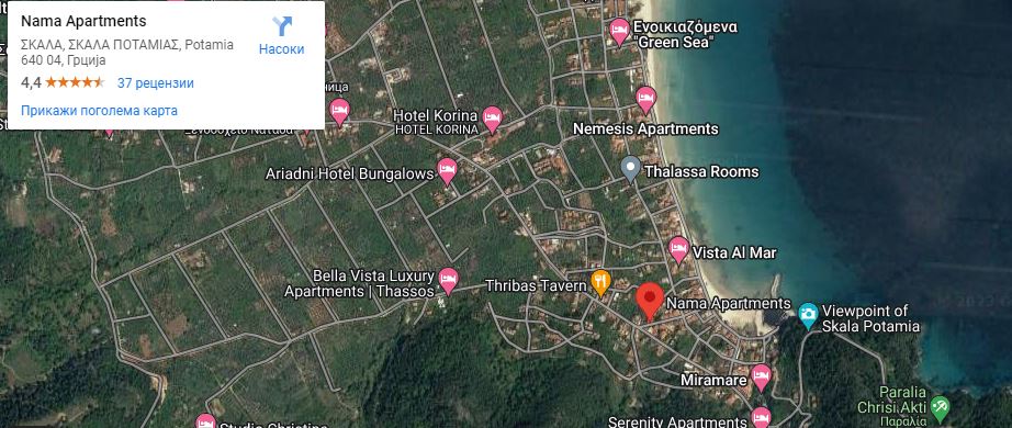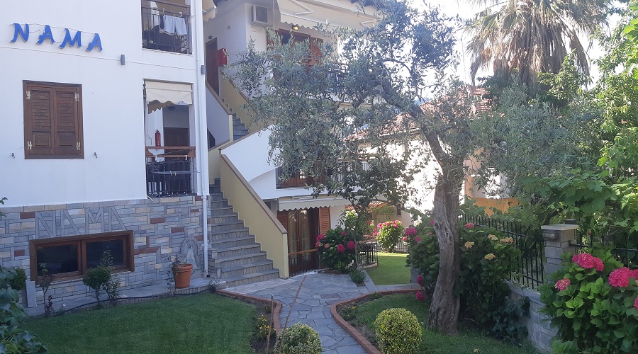 Вила “НАМА“ лоцирана во Скала Потамиа на оддалеченост околу 50 тина метри од плажата Голден биџ.Извонредна местоположба на вилата која излегува на една од најубавите плажи на островот.На само неколку метри од вилата има супермаркети,ресторани,таверни