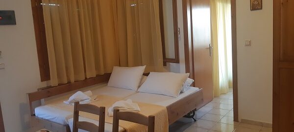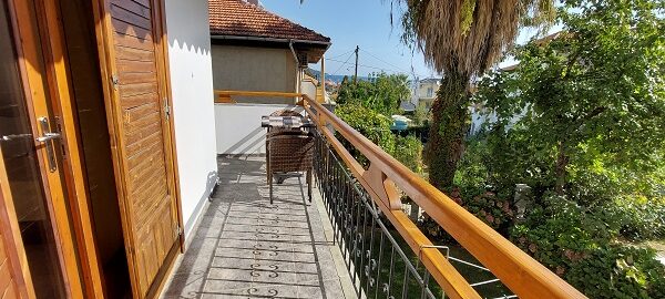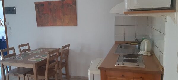 Апартманот се наоѓа на први кат и располага со две простории. Во првата просторија е кујната која е комплетно опремена со кујнски инвентар, мал фрижидер, шпорет со две рингли, аспиратор, микробранова печка, чајник и има кревет на извлекување наменет за спиење на 2 лица. Овде има плакар за алишта и клима уред. Од кујната се излегува на тераса со поглед во убав двор полн со зеленило. Втората просторија е спалната соба во која има еден дупли кревет комотен за спиење на две лица, ТВ и сеф за лични работи. И од спалната соба се излегува на тераса со поглед во убав двор со зеленило. Апартманот располага со стандардно купатило и WC со фен за коса.