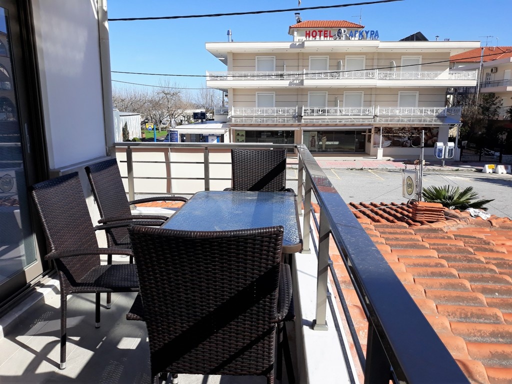 Вила “MEDITERAN се наоѓа во близина на луна паркот во Неи Пори, во првиот ред до плажа. Располага со убаво уредени трокреветни студија и апартмани со една спална за 4 лица, со комплетно нови купатила и кујни. Во трокреветните студија има еден брачен кревет и еден петосед (погоден за 2 деца или едно возрасно лице). Во апартманите со една спална има еден брачен кревет во спалната и уште еден брачен кревет во кујната. Секое студио/апартман е комплетно опремено со: кујна со комплетен прибор за онолку лица према број на легла, фрижидер..., тоалет, балкон со масичка со столчиња (со поглед кон улицата од студијата и поглед на море), клима, ТВ, гардеробер. Wi-Fi интернет - Бесплатен.